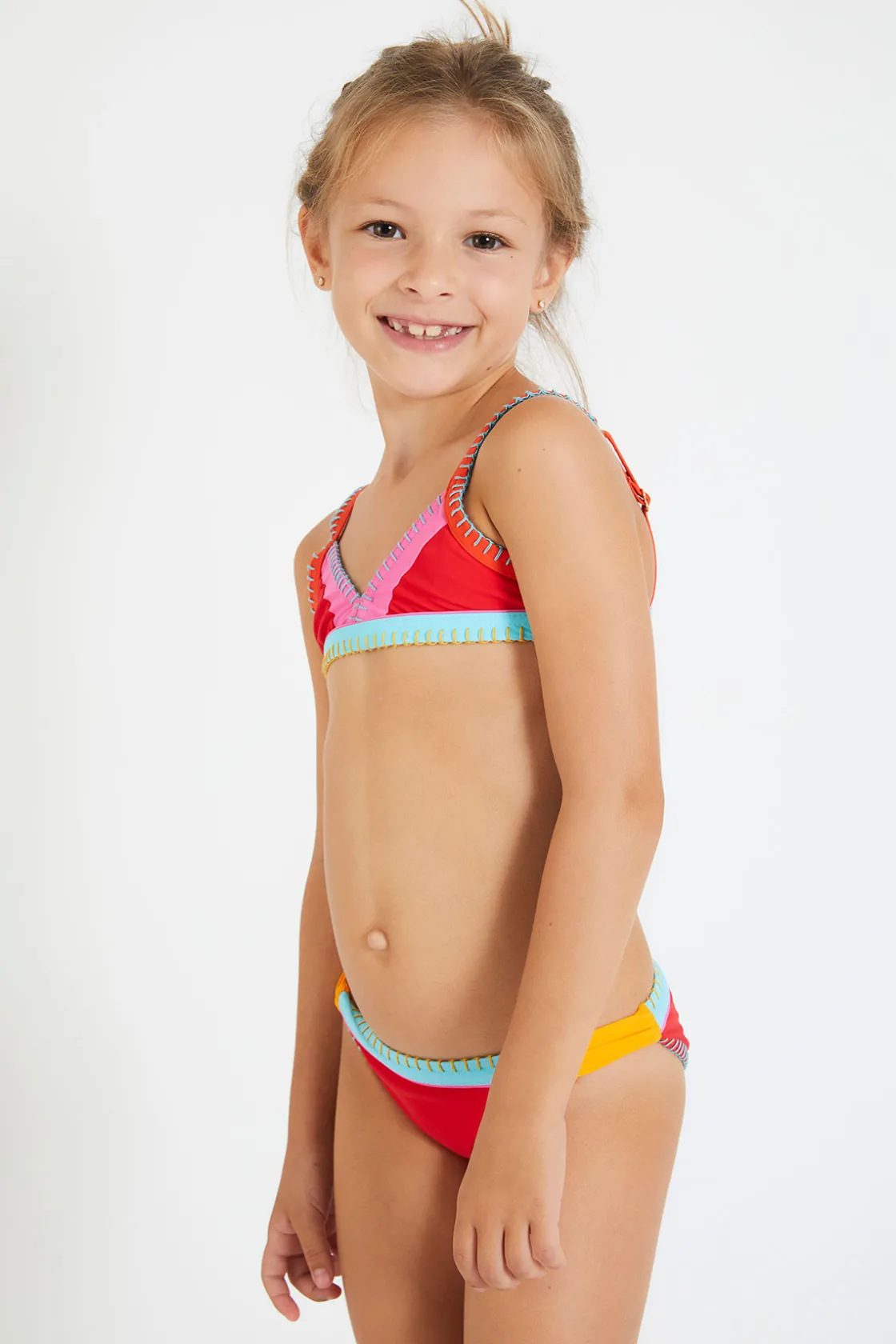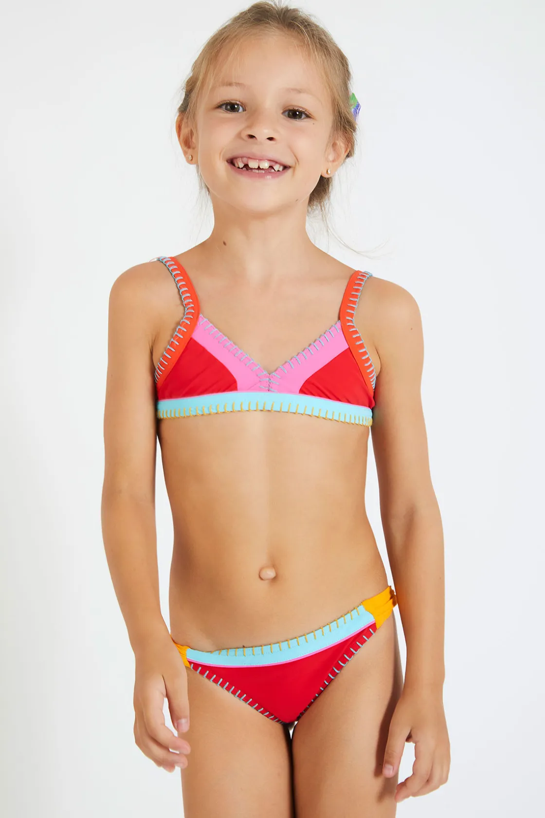 | Détails | • Maillot de bain 2 pièces enfant • Coloris rouge « colorblock » • Surpiqûres colorées • Bretelles réglables • Fermeture dos clip • Giulia mesure 1.30m et porte du 8 ans |
