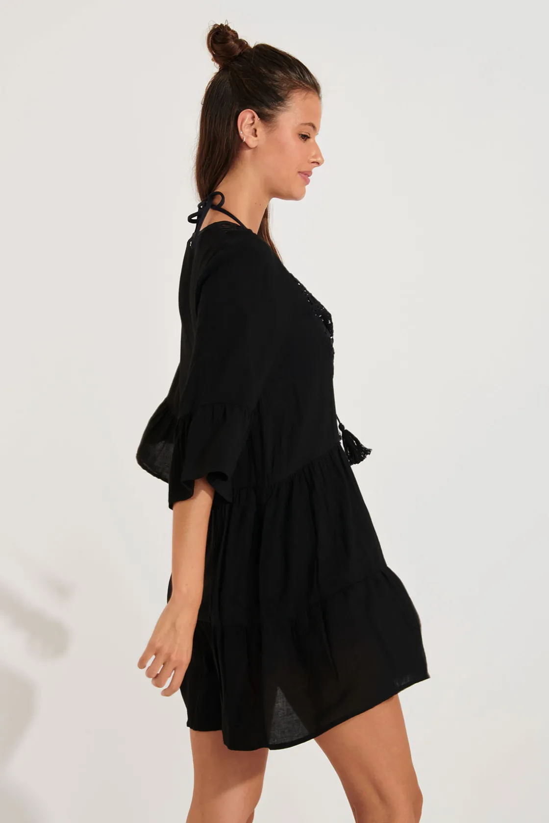 | Détails | • Tunique de plage • Coloris noir • Décolleté plongeant en dentelle • Liens avec pompons • Manches courtes amples • Coupe évasée |
