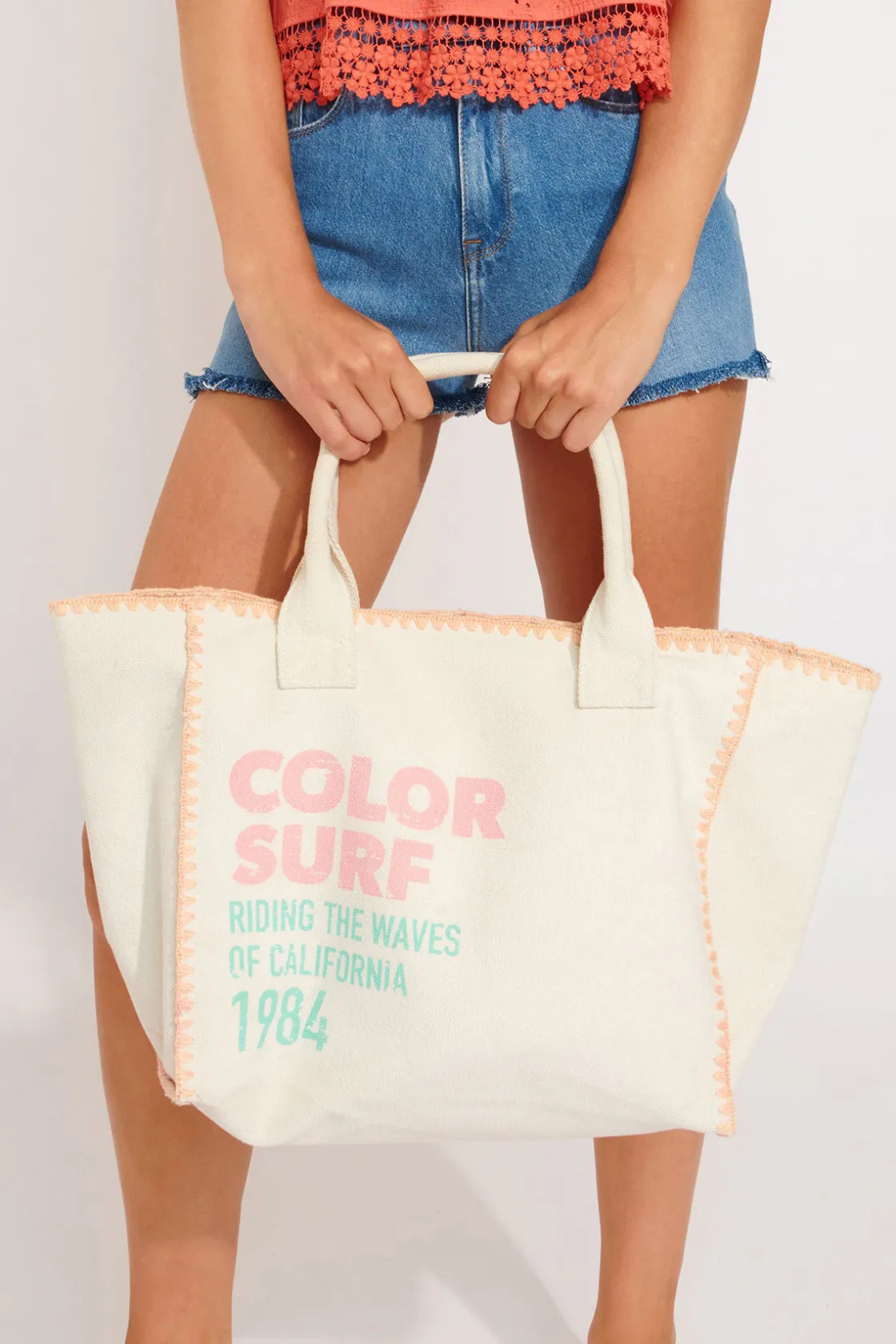 | Détails | • Sac cabas • Tissu • Fermeture zip • Surpiqûres contrastées rose clair • Inscriptions fantaisie • Dimensions : 32cm x 38cm |