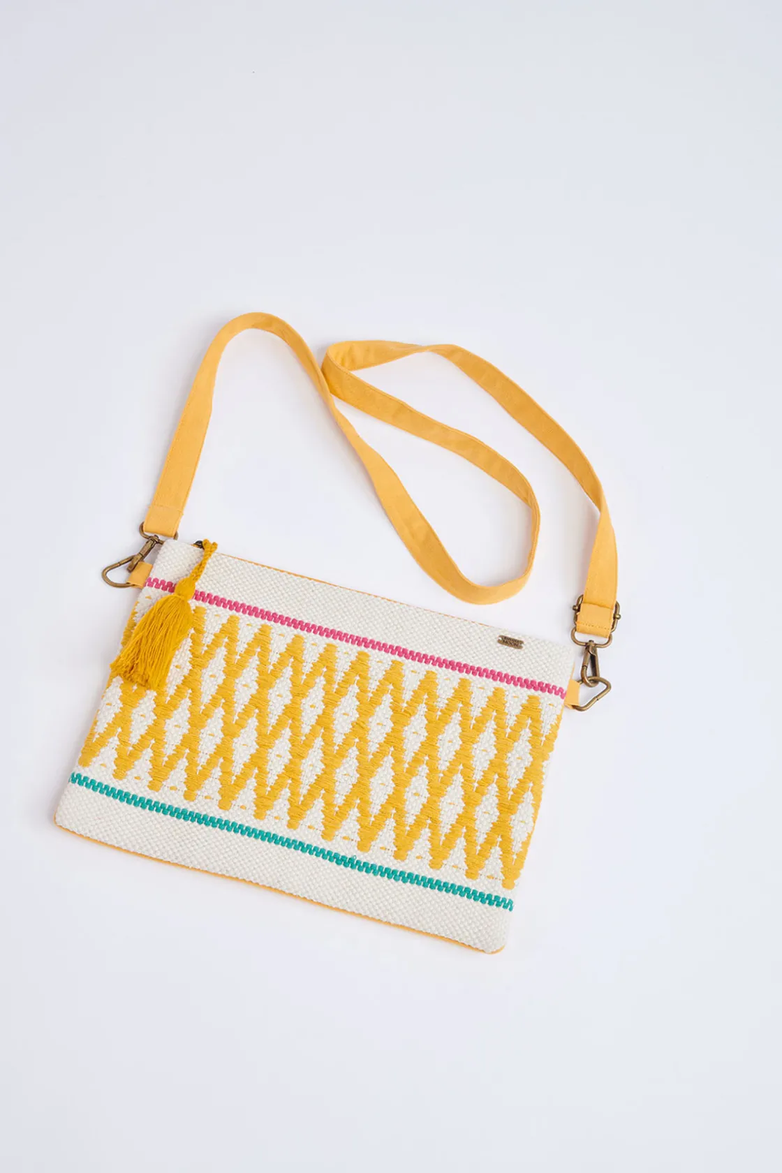 | Détails | • Pochette • Motif tressé jaune, rose et bleu • Fermeture zip • Bandoulière amovible • Dimensions : 33cm x 24cm |