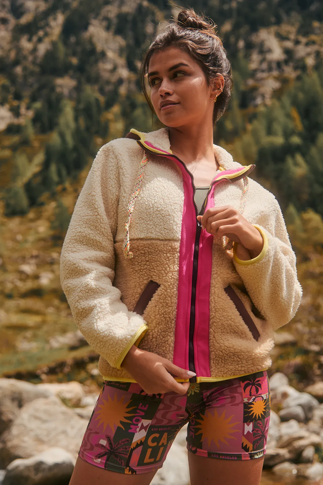 | Description | Veste en sherpa pour femme EAGLECREST ALIMI de la collection hiver Banana Moon. Découvrez cette veste zippée bi-matière à capuche. Une fusion parfaite de confort et de style, avec son design unique alliant polaire et inserts en nylon rose et jaune pop. |