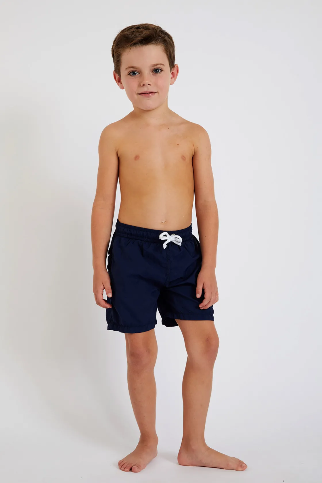 | Détails | • Short de bain enfant • Tissu uni bleu marine • Lien de resserrage • Slip intérieur en maille filet • Poche arrière |