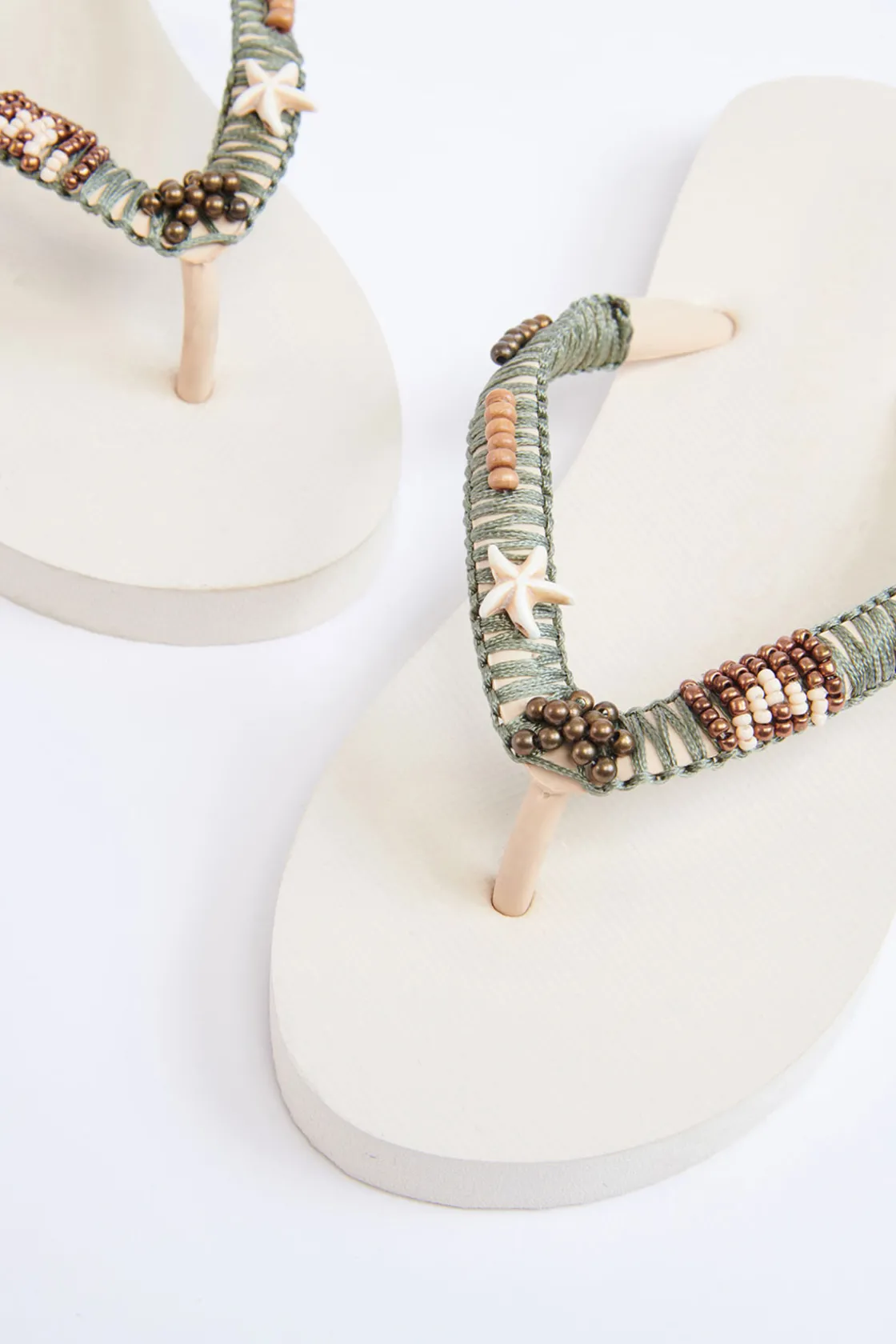 | Détails | • Tongs en caoutchouc • Bride en caoutchouc • Bride ornée de coquillages et perles |