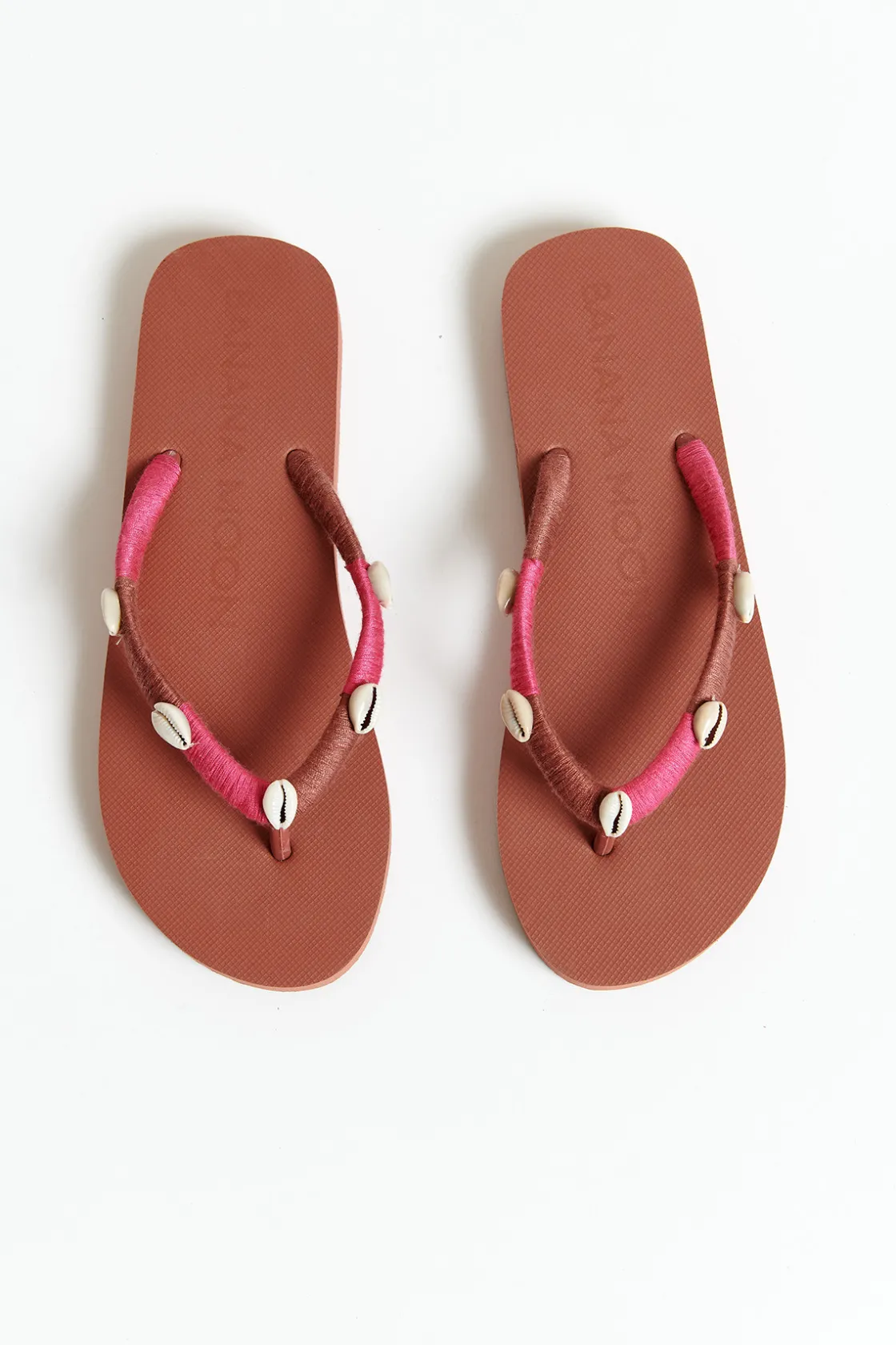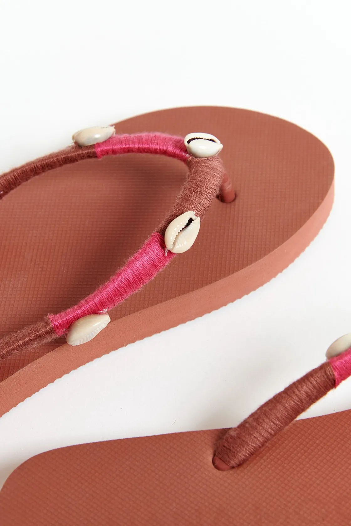 | Détails | • Tongs en caoutchouc • Bride ornée de coquillages |